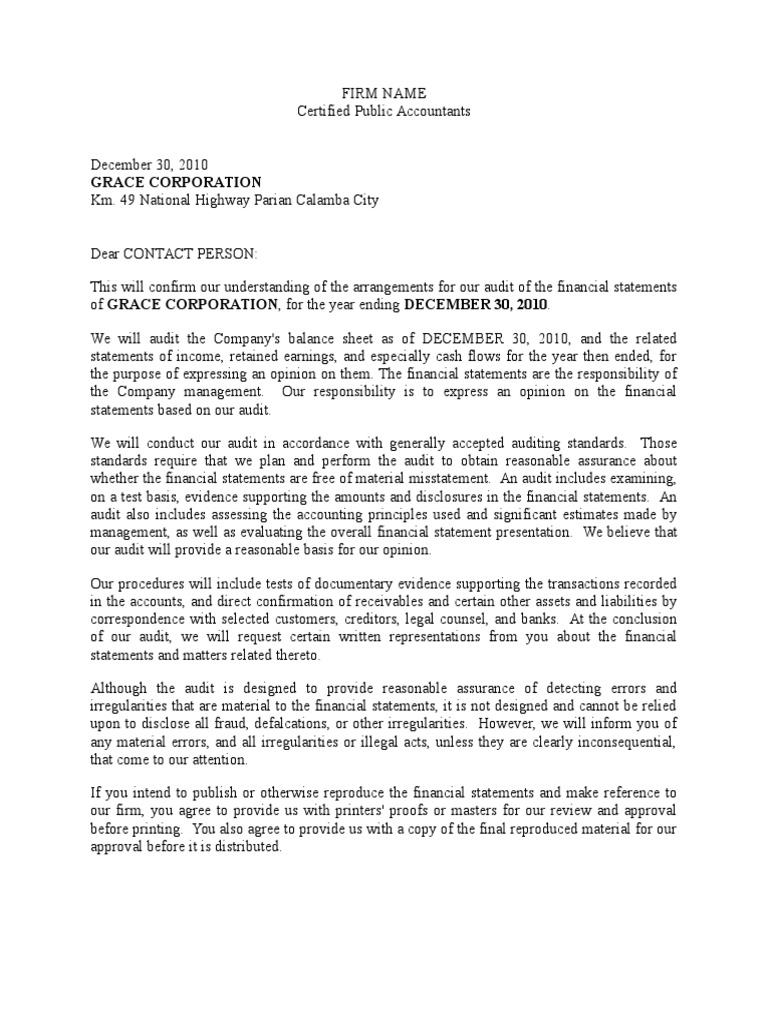 Audit Engagement Letter Cpa Audit Financial Statement